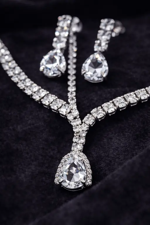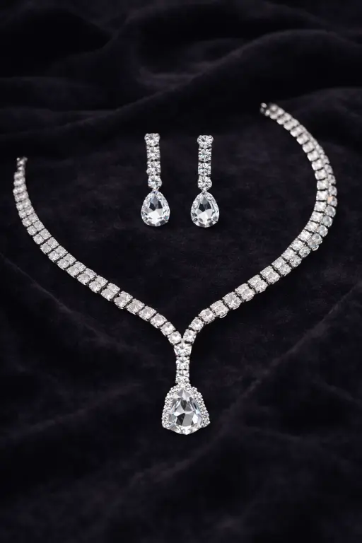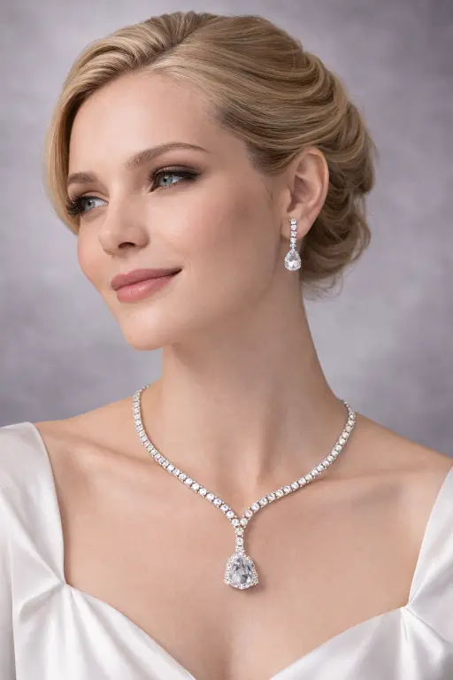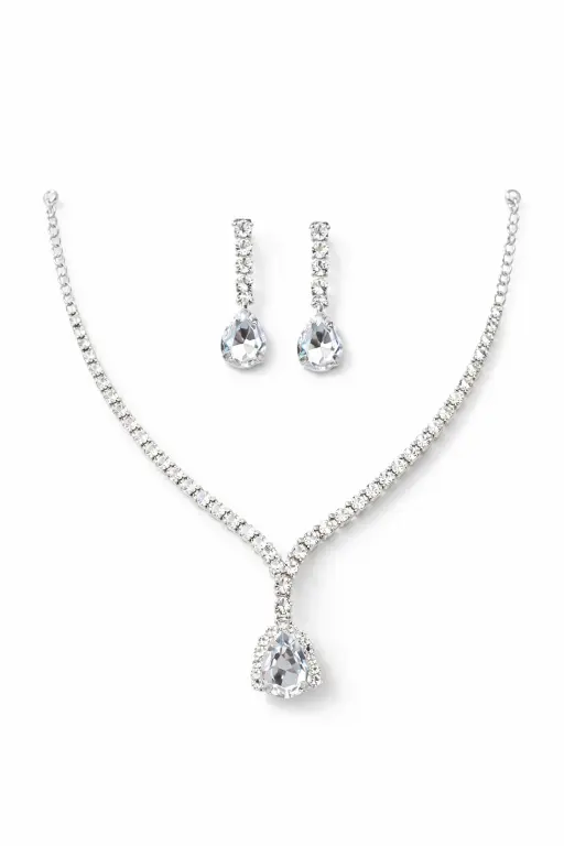 The sleek stone line leads into a teardrop pendant that adds just enough detail without making the piece feel heavy. Paired with matching drop earrings, it creates a balanced, polished look that works effortlessly for formal wear.