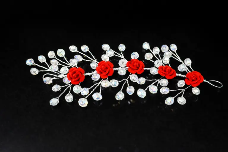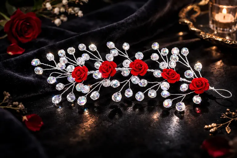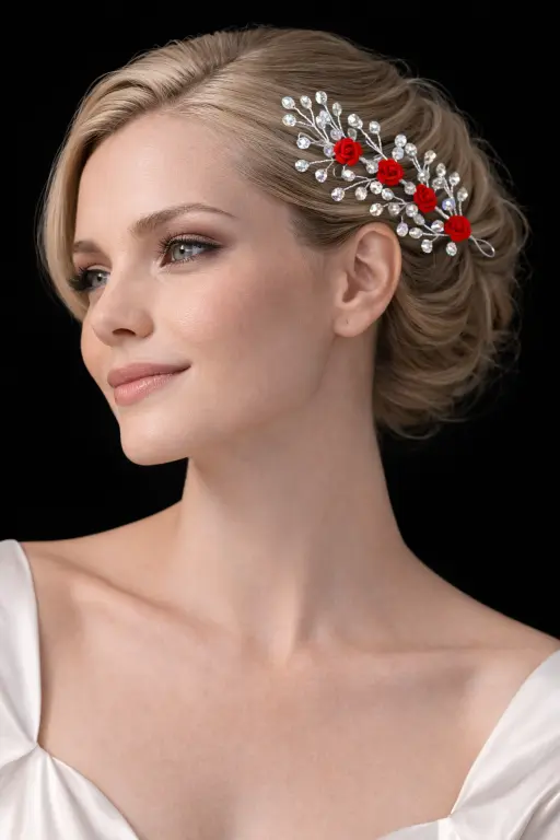 The soft crystal branches paired with bold red floral accents create a beautiful contrast that stands out without looking overdone. It blends easily into buns and side styles, adding depth and a subtle sparkle from every angle.